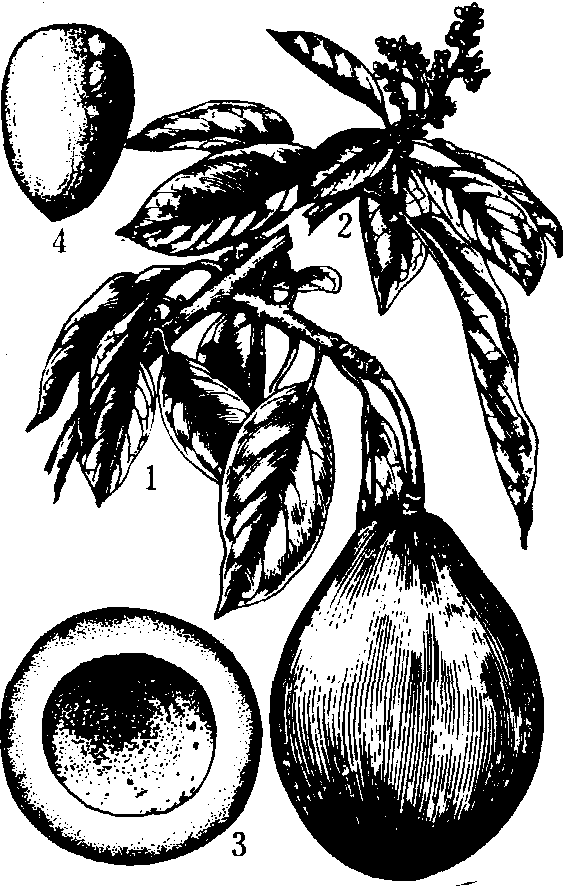 油 梨1. 果枝; 2. 花枝; 3. 果实横剖面; 4. 种子 油梨花有开闭两次的特点, 雌雄异熟。按雌雄蕊成熟时间不同分为3个类型: A型花, 第一次开花在上午, 雌蕊成熟, 柱头容授, 但花药不成熟, 中午闭合; 当天或次日下午第二次开放, 雄蕊成熟,可传粉,但柱头萎黄凋谢, 不容授。B型花, 雌雄蕊成熟期和容授性与A型花相反。交叉型花,雌雄蕊成熟期重叠,可单株结实。同一品种花型相同,但环境影响也可出现雌雄蕊成熟期重叠现象。交叉型花品种少。A型花品种或B型花品种单独种植, 或花期不同的两种花型品种混植, 都会由于未能授粉而不能结实。 年降水量1000毫米以上的热带亚热带地区,均可选适宜当地种植的品种种植。土壤深厚肥沃排灌良好的沙壤土或冲积土为最宜园地,一般要求地下水位3~5米, 忌在地下水位高的粘重土建园。 主要品种 按原产地不同分为3系:❶墨西哥系。墨西哥中部和北部高原原产, 能忍受-4.4~-6.7℃的低温, 适于亚热带地区栽培。果小、夏季成熟, 含油率较高。 ❷危地马拉系。危地马拉和墨西哥南部高地原产。-4.5℃则冻害严重,适于温暖亚热带地区种植。果实较墨西哥系略大, 含油率较低, 冬季或春季成熟。 ❸西印度系。中南美低地原产。-1℃低温会遭寒害, 适于热带地区和无霜冻的亚热带地区种植。叶大果大, 果实含油率最低, 夏季或秋季成熟。目前商品栽培品种多为这3系的杂交种, 命名品种数十个以上, 其中较优良的有富尔特(Fuerte)、哈斯(Hass)、杜克(Duke)和墨西哥拉(Mexicola)等, 成熟期、果实大小等均有差异。中国除台湾外, 多种植实生苗, 变异大, 有不少丰产优质单株, 可选作繁殖材料, 但成熟期多集中在8月至10月。 栽培技术要点 多用种子和嫁接繁殖。种子具多胚, 在种子近胚生长点部位剖开后催芽, 可增加出苗数。最好用容器育苗, 苗径粗0.8~1厘米便可嫁接,多用芽接或腹接法。苗高50~60厘米可定植, 栽植株行距5~6米。要混植花型相反而花期相同的品种方能丰产。幼树适度遮荫有利于生长, 37℃以上的高温抑制生长。沿海地区台风多, 需配防护林。花期要保持土壤湿润。嫁接苗定植3~4年或实生苗4~6年开花结果。成龄树株产25~50千克, 高产的100~150千克。果皮富光泽或摇果有响声、能浮于水面便可采收。果实有后熟过程, 熟后果肉变软。成熟果可在树上留2~3个月,在美国加利福尼亚州,Hass和Fuerte 两品种可树上留果6个月。油梨根腐病 (Phytophthora cinna-momi Rands)是最主要的毁灭性病害,要注意预防。零星种植此病少发生, 成片种植易发病。严格选种, 种子50℃处理30分钟, 用抗病砧木, 苗圃消毒, 降低果园地下水位, 防止渍水和过分荫蔽, 合理施肥, 少伤根等措施有防病效果。主要害虫有潜叶蛾、金龟子、蚜虫等。 经济价值 油梨果肉含脂肪8~30%,蛋白质1~3%,碳水化合物2~9%, 多种氨基酸的含量均约为鸡蛋的1/15,为高能低糖易消化的保健食品,尤适于糖尿病患者等病弱者食用。可鲜食, 或与糖、牛奶、咖啡等拌食, 可制色拉、饮料、冰淇淋或作面包、饼干的夹心等。油梨油可食用, 可制高级化妆品, 作机械润滑油和医药原料。经济价值较高,每吨鲜果售价800~1000美元,是有发展前途的热带亚热带水果。中国年降水量1000毫米以上、1月最低气温在0℃以上的热带亚热带地区, 可选适栽品种试种发展。 油梨avocadoPersea americana Mill.,又称鳄梨。樟科,鳄梨属。常绿乔木。为热带新兴果树之一。原产美洲热带,中国广东和福建省有引种栽培。树高达20 m,树冠广阔。叶革质,长圆披针形至椭圆披针形,先端急尖,基部宽楔至圆形。花小,两性,多数密集呈圆锥花序,着生于小枝顶端。果大型,常呈梨形、卵形或球形,黄色或黄绿色;果肉质地如奶油,橙黄色,气味芳香。种子圆形或圆锥形。以嫁接繁殖为主。果实富含脂肪,气味芳香,营养丰富,供食用,也可榨油。树形美观,可供作绿化观赏树。