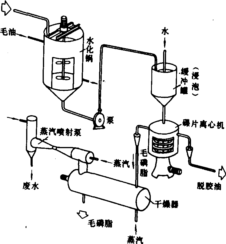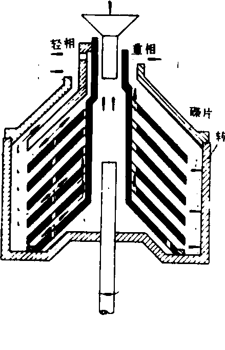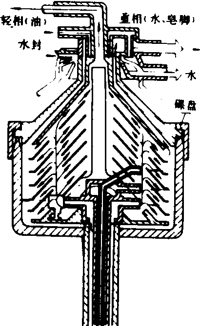 图6 连续物理精炼典型流程 氢化罐 属带搅拌装置的密闭容器,由氢化罐、压滤机、催化剂罐组成。 油脂氢化系指在一定压力、温度与存在催化剂的条件下通氢气(加氢),使油中原来不饱和的脂肪酸饱和,即“硬化”。目的在于提高油脂氧化稳定性,使色泽变浅、除去异味从而扩大用途。氢化罐的操作按:进油、(催化剂)、真空除气、加热(至160℃左右)、加氢(自动升温至220~240℃)、测定与冷却等程序周期性地进行。要求氢化罐密封、耐压、充分搅拌使氢气与油脂充分接触。装在氢化罐内的搅拌装置的型式有高速平桨式、涡轮式、低速多级型以及泵抽出自循环搅拌型等。 连续式炼油设备 全部工序实现连续化生产。其特点是密闭、紧凑、操作稳定,适合于大中型油厂(50吨油/日以上)以及油源质量稳定的场合。但设备结构复杂、造价高、操作维修要求高。 连续炼油工艺包括:碱炼、脱色、脱臭以及物理精炼等,可根据要求加以组合。连续炼碱典型流程(图4)中的主要设备是离心机;连续脱色脱臭典型流程(图5)中的主要设备是脱臭塔;连续物理精炼典型流程(图6)中的主要设备是物理精炼塔,它与脱臭塔结构相似,有时可以合用。 离心机 有管式和碟片式两种。❶管式离心机。由高速转筒、锥形外壳、吊轴以及传动装置等构成,属高速沉降式离心分离机。工作时,含水化磷脂或皂脚的油从下部进口管连续地喷入转筒内,靠内部三片旋翼使油与皂脚(或磷脂)一起高速旋转(15000~20000转/分)而产生离心力,比重大的皂脚沿转筒内壁上升,经分离隔圈从出皂口排出。而轻相油脂则从转筒中心逐步上升,经上端6个小孔流出达到分离的目的。 ❷碟片式离心机。由转鼓、机身、进出口管以及传动机构等组成(图7),属沉降式离心机。主要部件转鼓由若干锥形碟盘按一定间隙(1~2毫米)叠置而成。与管式相比,具有处理能力大、噪音低、运转平稳、分离效果良好等特点。但结构复杂、造价高。广泛应用于大中型油厂。其主要机型有普通无水洗、普通水洗以及水洗自清理三种。普通型操作压力为500千帕,自清理型为40~100千帕。转速6000~8000转/分。