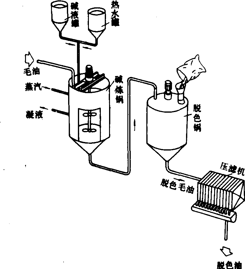 图2 间歇式碱炼与脱色工序 脱色锅 属密闭真空容器。由锅体、搅拌装置、减速装置、盘管以及真空系统(机械真空泵、汽水喷射真空泵)等组成。其操作包括预脱色和脱色两个程序。先将水洗后的碱炼油用真空泵吸入锅内,搅拌升温到90℃进行脱水后再吸入吸附剂(酸性白土、活性白土与活性炭等),再搅拌冷却(约70℃),然后将油泵入压滤机过滤,得预脱色油,再送回锅内继续进行后脱色(程序与预脱色相似,无脱水)