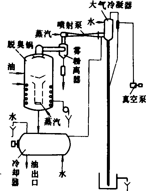 图3 间歇式脱臭装置 脱臭锅 属密闭真空容器,结构如图3。无机械搅拌而设直接蒸汽喷头与高压蒸汽、导热油或导热姆(道生,Dowtherm)等高温介质间接加热盘管(或夹套)等,因脱臭操作是在高温(220~260℃)、高真空(残压533~1333帕)条件下,喷入直接蒸汽进行汽提,脱除经脱色后油中残留的臭味物质(醛、酮类、蜡留醇、维生素E、低级游离脂肪酸、微量溶剂与白土气味等)的过程,对设备材料与结构要求刚性好、耐高温和耐腐蚀,宜用不锈钢制作。