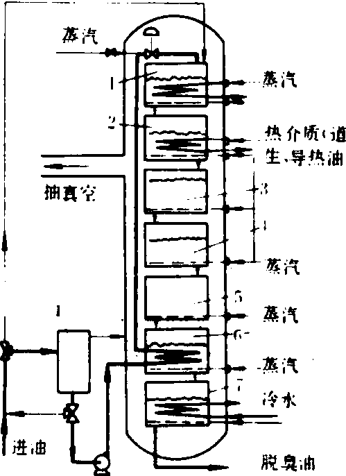 图7 碟片式离心机结构示意图 脱臭塔 又称物理精炼塔。将脱色油连续地进行除气预热、直接蒸汽预脱臭、滞留脱臭、终脱臭及冷却(热交换)等过程的专用塔。一般结构原理如图8所示。为保持生产的连续性和油脂有足够的停留时间,通常借助每一层溢流口及管路予以控制。其特点是处理量大、蒸汽耗用量均匀,但对原料规格要求严格、脱臭效果不易一致。不适用于经常更换油品的场合。