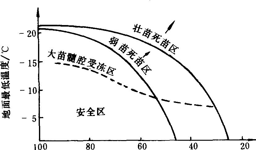 冻害及防御 冻害是影响油菜产量的主要因素之一。有苗期(或越冬期)冻害、蕾薹期和开花期冻害三种, 以苗期冻害最为严重。冻害的严重程度与寒潮来临迟早、降温程度、低温持续时间等气象条件有密切关系。寒潮来临早, 骤然降温、低温持续时间长、冬季雨雪少、空气和土壤相对湿度小, 冻害严重。油菜越冬死苗与土壤水分、最低温度关系如图。开花期冻害的主要特点是当气温下降到0℃左右时,已开放的花朵脱落,形成分段结实现象。防寒措施:❶适期早播,培育壮苗,增强植株体的抗寒能力。