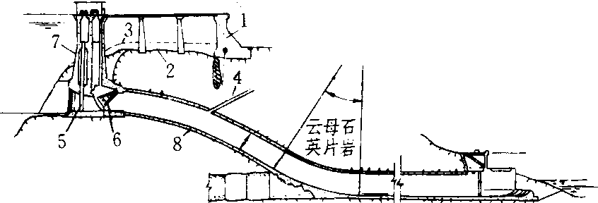 泄洪隧洞 1.混凝土副坝 2. 岩面线 3. 原地面线 4. 通风洞 5. 检修门槽 6. 弧形门 7. 进水塔 8. 隧洞 |