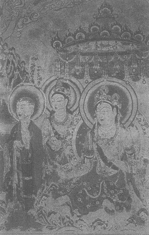 | 释义 | 法华经变(局部)壁画盛唐。纵130厘米,横80厘米。甘肃省敦煌县莫高窟第103窟南壁壁画。菩萨梳高髻,戴宝冠,衣裙华丽,装饰繁复。双目平视,神情端庄,其形象令人崇敬。头顶所悬华盖绘制十分细腻,弟子披通肩袈裟,形体瘦小,一张年轻的面孔上稚气十足。赋色以红、绿为主,醒目而不俗艳。无论是线描还是赋彩都可看出画工的熟练技巧。