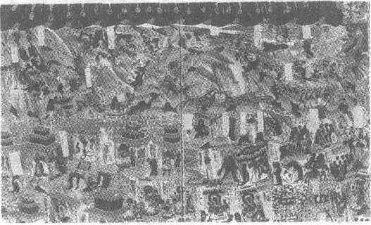 | 释义 | 法华经变(普门品)壁画隋。纵55厘米,横390厘米。甘肃省敦煌县莫高窟第420窟窟顶东披壁画。《法华经》又称《妙法华经》、《妙法莲花经》共28品。佛经中称释迦成佛以来,寿命无限。现各种化身,“以种种方便,说微妙法,”以为一切众生,都能成佛。此为莫高窟艺术中早期《妙法莲花经变·观世音菩萨普门品》之一。佛经讲,人在遇到危难时,口诵观音名号,即可得免。画分三层,上层绘商人遇盗,将商人出发前的祈佛,道路遇灾难,直至观音的显现描绘得甚至比佛经所述的还要详尽。例如画面中有骆驼失足滚下山崖和途中行商为病驼灌药的场景。中层为观音菩萨“三十三身”。下层绘“观音菩萨救苦救难,有求必应”。其中有些场面相当感人。画面内容虽为佛教题材,但驼队的场景,不免使人联系到丝绸之路商侣的情景。