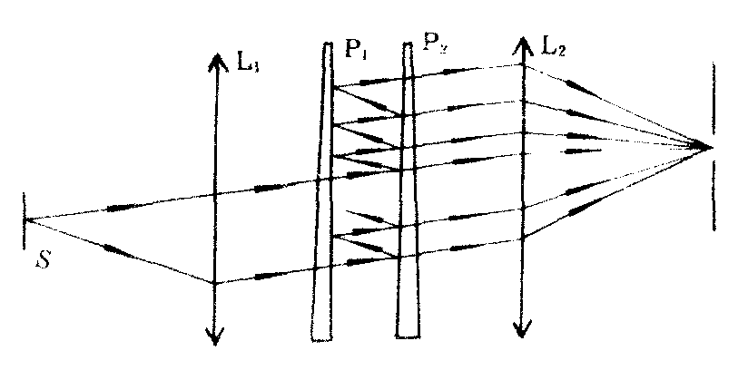 | 释义 | 法布里—珀罗干涉仪fabuli-poluo gansheyi一种分振幅多光束干涉仪。1897年,法国物理学家法布里和珀罗合作制成。干涉仪的主要组成部分是两块楔形玻璃(或石英)板P1和P2,P1和P2相对的内表面互相平行,且镀有高反射率的反射膜,膜表面与理想平面的偏差不能超过光的波长的1/20,P1和P2之间构成平行平面的空气薄膜,称之为法布里—珀罗腔。P1固定,P2可移动,借以改变薄膜的厚度。若在P1和P2之间放置热膨胀系数很小的殷钢环,把薄膜的厚度固定,则成法布里-珀罗标准具。如在一块平行平板玻璃(或石英)的两面镀上高反射膜,也可当成标准具使用。准单色扩展光源S位于透镜L1的焦平面上,经L1折射后,出射光为平行光束,又经P1折射后进入空气薄膜,光束在两反射膜之间多次往返反射,同时有多束透射光从P2射出,它们在透镜L2的后焦面上相遇,产生细锐而明亮的同心环状等倾干涉条纹。P1和P2的外表面不平行,是为了消除它们产生的反射光也参与干涉。