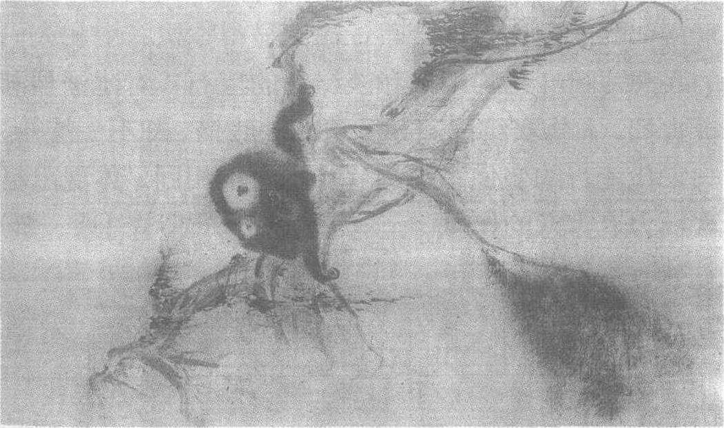 | 释义 | 法常《松猿图》绢本,淡设色。纵173.9厘米,横98.8厘米。现藏日本京都大德寺。画面描绘一老松枝干上一只长臂猿保护小猿的情景。母猿好像发现了敌情,把小猿紧紧地抱在怀里,挤作一团的小眼睛死死地盯住前方,那紧张而严肃的表情,使观众感到很有趣。画面是否有特殊含义,不得而知。不过与法常同时的南宋禅僧智愚留有题法常松猿图诗 “霜堕群林空,一啸千岩静。耿耿殊有情,劳生发深省。抱子攀危枝,清兴在高远。一点钟爱心,业风吹亦断。”智愚用禅宗的观念衡量大千世界,把 一切看得都如过眼云烟,猿所表现出来的一点钟爱心,也很容易被“业风”吹断,所谓业风是指尘世的纷烦。老松缠绕枯藤,画得很随意,长臂猿的五官被画得挤成一团,增加一种紧张气氛,猿越紧张,越觉得可笑。暗寓某种禅理。