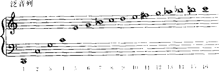 | 释义 | 泛音列Fanyinlie由发音体发出的合成音列。发音体所发出的音,一般都是复音(亦称复合音)。以琴弦振动为例,当琴弦被拨动时,除了琴弦整体振动所产生的基音外,其1/2、1/3、1/4等各等分部分也都同时在振动。分段振动所产生的音为泛音,其频率为基音频率的整数倍。下列是基音为大字组C的泛音列: (最初十六个音)