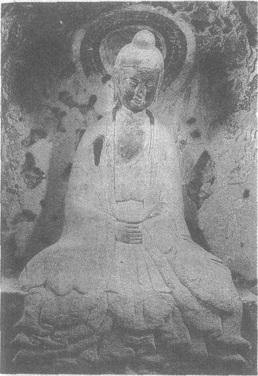 | 释义 | 泥塑坐佛像北魏。通高94厘米。甘肃省天水市麦积山石窟第112窟右壁龛内塑像。佛像背壁上绘火焰纹背光。头顶作磨光高肉髻,内着僧祗支,下系裙,外披敷搭双肩的袈裟,衣裙于方形佛桌前自然下垂。双手置腹前作禅定印,呈结跏趺坐式。面目方圆适中,弯月样的细目与高鼻梁相连,头微低,面露笑容,眉宇之间透露慈祥和宽容。