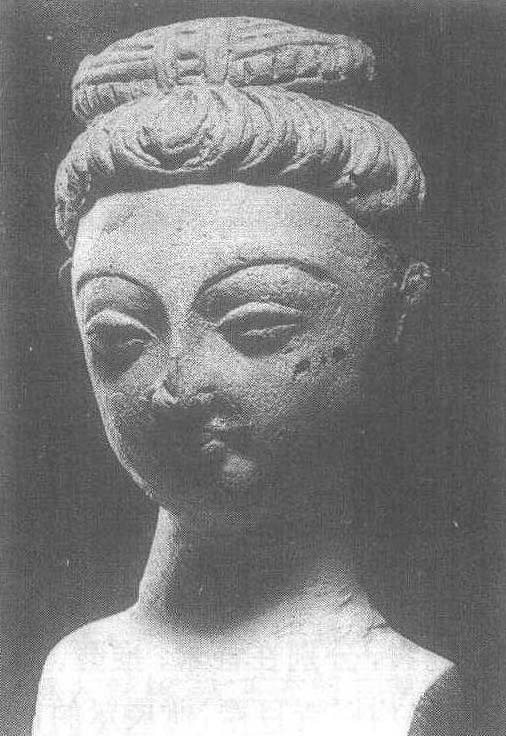 | 释义 | 泥塑女供养人头像初唐。残高8.5厘米。1957年新疆焉耆锡克沁寺院遗址出土。新疆维吾尔自治区博物馆藏。此泥塑头像的头发梳成多股小辫后,挽在一起形成平顶髻。瓜子脸形,脸颊的线条柔和。双眉弯如弓,两眼因微笑而微微眯起。鼻梁挺直通额际。小嘴嘟起,嘴角内陷。作者以高超的雕塑技艺,创作出这位西域少女天真、妩媚之态,其栩栩如生的形象令人赞叹不已。