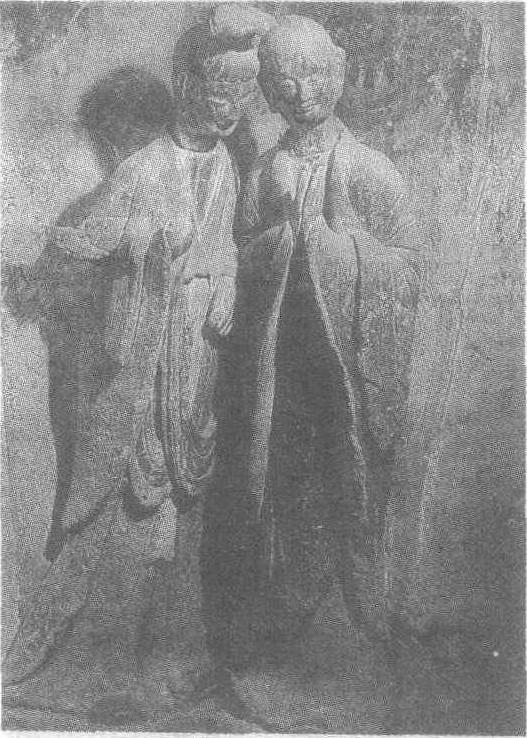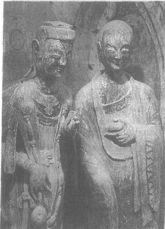 泥塑胁侍菩萨与弟子像北魏。菩萨高115厘米,弟子高114厘米。甘肃省天水市麦积山石窟第122窟正壁右侧塑像。此为菩萨与弟子低声交谈的情景。菩萨面形瘦长,身材苗条,头戴一冠,胸佩宽项圈。内着僧祗支,披肩搭肩后交叉于腹前,腰系长裙。头微低,笑容可掬。右手提净瓶,左手捻花蕾。弟子面庞清秀,五官细致柔和。身披通肩袈裟,手持一钵,脸上的笑容透出柔顺和文雅。二人的身体不成直立状,上身与下肢形成一定的角度,其亭亭玉立之姿与俊美之貌十分吻合,给人以美感。菩萨身体装饰的繁复与弟子衣饰的简单形成合理的对比,对人物身份和性格的塑造起到了一定作用。
