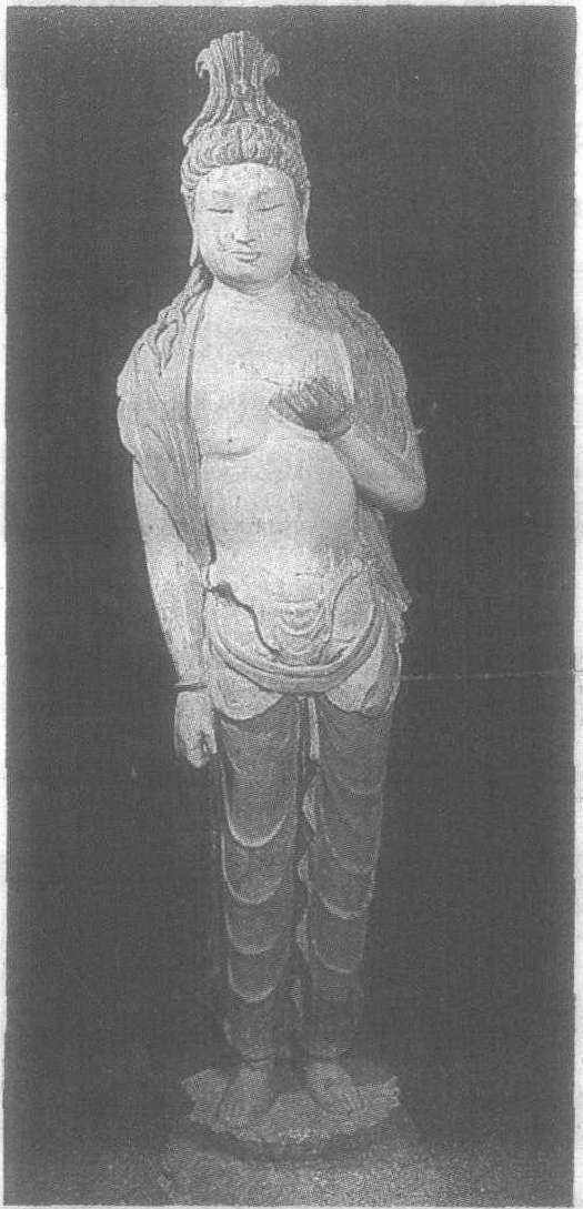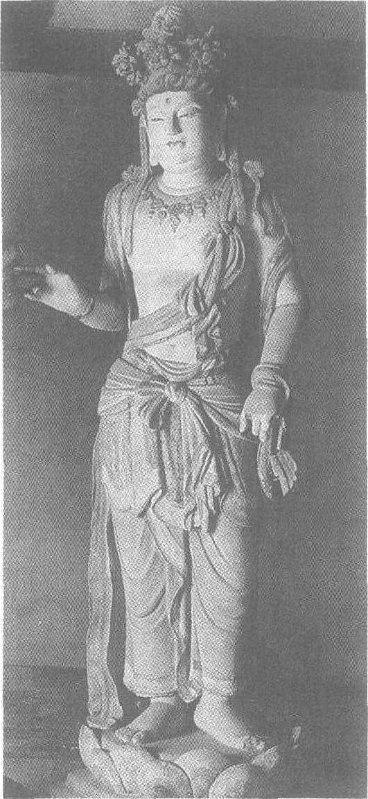 泥塑菩萨像北凉。高135厘米。甘肃省张掖县金塔寺西窟中心柱东面下层龛外北侧塑像。头戴高宝冠,上身裸露,胸前缀满璎珞。质料具有轻薄之感的长裙系于腰间,裙紧贴双腿,显露出优美的曲线。肩披长巾自双肩绕下,迎风飞扬,飘逸潇洒。菩萨面形秀丽,五官灵巧,给人以纤柔之感。但其眉宇间又透出一股英气,外柔内刚,令人肃然起敬。