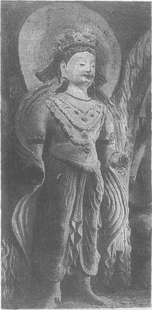 泥塑菩萨像唐。高180厘米。甘肃省凉州天梯山三窟塑像。甘肃省博物馆藏。菩萨发髻高耸,发丝毕露。上身裸露,披巾搭肩垂至臂旁。下着红裙,似丝绸类薄料,紧贴双腿,有如当今流行的裙裤,衣折如流水般自然。肌肉丰满,身材匀称,站立呈“S”形。面目的塑造极少宗教意味,而更似一般的民间妇女。双手柔嫩,皮肤的质感很强,浑身上下充满女性的魅力,极具唐代雕塑的艺术特色。