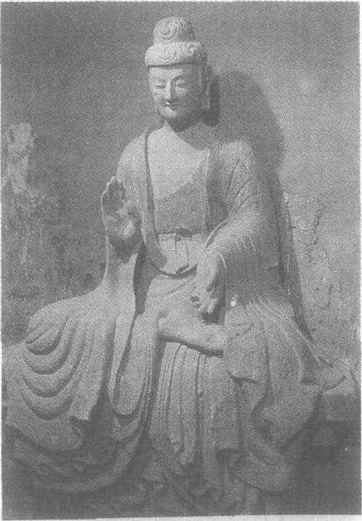 | 释义 | 泥塑释迦像西魏。高163.5厘米。甘肃省天水市麦积山石窟第44窟正壁。佛的高髻纹路旋转,似一朵盛开的鲜花。身披褒衣式袈裟,衣裙的下摆覆于佛座,衣褶粗犷豪放,质感厚重,使佛像具有稳定之感。结跏跌坐,一脚露于衣外,作施无畏印。面颊丰满不失秀丽,五官玲珑,凤眼下视,嘴含微笑,形象取自于当时的贵妇,摆脱了外来影响。其面目及神情给人以沉稳、慈样之感,那温婉善良的神情给人以莫大的安慰。
