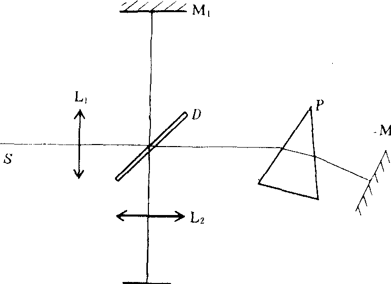 | 释义 | 泰曼干涉仪taiman gansheyi一种分振幅双光束干涉仪。1916年,泰曼和格林建议对迈克耳孙干涉仪作改进,以便用来检验光学元件的质量。1918年,制成了用来检验棱镜的干涉仪;1921年,制成了用来检验透镜的干涉仪。检验棱镜质量的泰曼干涉仪如图所示。点光源S位于准直透镜L1的前焦点,从L1出射平行光,被分光板D分成互相垂直的反射光和透射光。反射光被平面镜M1反射,再从D透射到达物镜L2;而透射光通过待测棱镜P,棱镜处于最小偏向角的位置,透射光被M2反射,按原路通过P,再被D反射,也射向L2。若待测棱镜质量好,两束光产生干涉,在L2的后焦面上呈现均匀亮度;否则将出现干涉条纹。如果让干涉条纹定域于棱镜的一个表面,观察者还可描绘出棱镜缺陷的位置,从而指导进一步如何加工。用泰曼干涉仪还可检测平行平板的质量,制备固体激光器的谐振腔,用来精密测量红宝石棒或钕玻璃棒两端面的平行度。若把M2换成球面镜,P换成待测透镜,让透镜的焦点和面镜的焦点重合,并且使从D出射的透射光垂直入射,用同样的方法就可以检验透镜的质量。