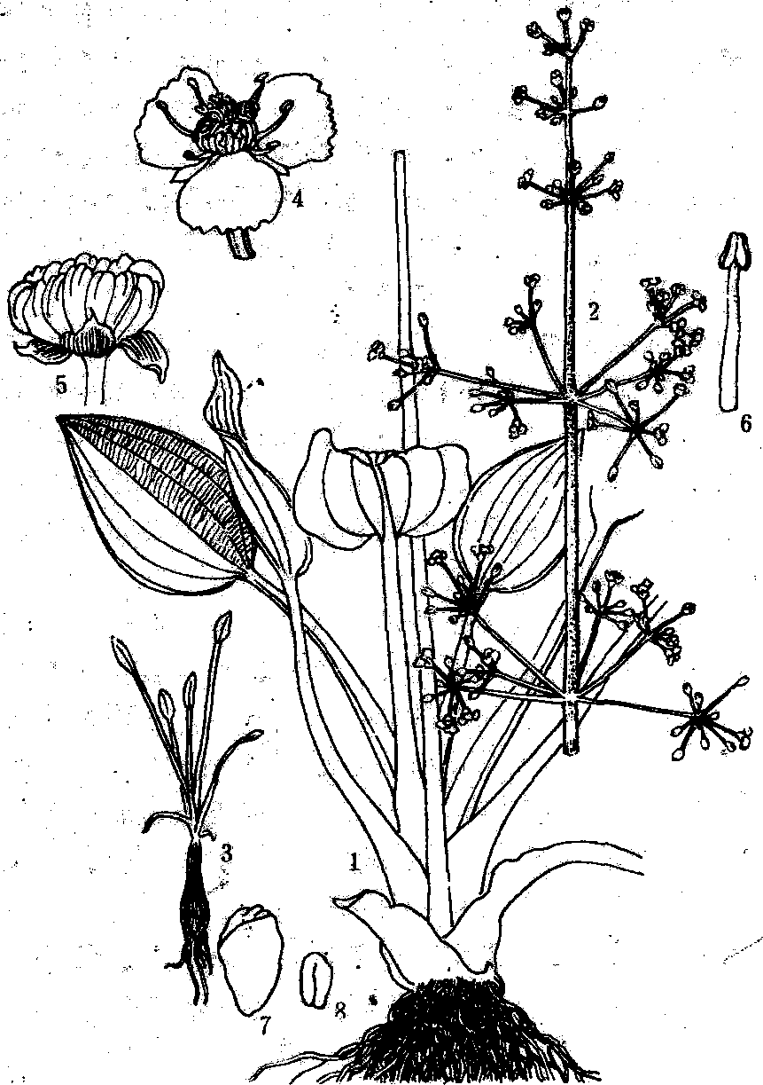 1. 植株; 2. 花枝; 3. 幼苗; 4.花; 5. 果;6. 雄蕊;7. 种子; 8.胚 慈姑属和泽泻属(Alisma)常为淡水水域中的迅速定居者,在水生群落演替中常起着先锋种的作用。药用的有泽泻(A.plantagoaquatica)和慈姑(Sagittariasagittifolia var.sinensis),慈姑球茎也供食用。矮慈姑(S.pygmaea)为稻田常见杂草。此外,本科在分类系统中,对于探讨单、双子叶植物之间的关系及它们的起源具有重要的意义,因为衍生单子叶植物的双子叶植物类群,多与泽泻目存在许多共同的特征。 泽泻科waterplantain family; Alismataceae单子叶植物。水生或沼泽多年生或一年生草本。茎和叶具裂生乳汁管,但慈姑属(Sagittaria)无乳汁管。叶常基生,叶柄长,基部具开放的叶鞘;叶片椭圆形、箭形或戟形,或线状披针形,弧状叶脉。总状或圆锥状花序;花有苞片;两性或杂性,辐射对称;萼片3枚,不脱落;花瓣3枚,白色,早落;雄蕊6至多数,稀3枚,花粉多具散孔;子房心皮3、6或多枚,轮状或近螺旋状排列,胚珠1或多枚。瘦果,少数为蓇荚果。胚马蹄形,无胚乳。染色体x=5~13。本科13或14属,90种,广布北半球热、温带地区。中国5属,约13种,南北方均有分布。药用有泽泻和慈姑;慈姑的球茎也供食用;矮慈姑为稻田常见杂草。 |