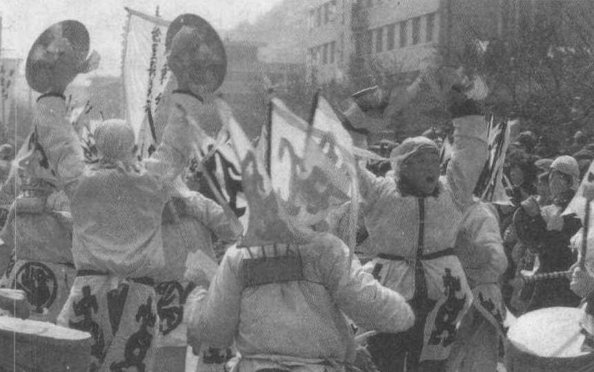 | 释义 | 洛川蹩鼓流传于洛川县黄章、永乡、旧县等乡镇的一种民间鼓舞。舞者按古代军卒打扮,穿战裙,扎靠旗,腹前横挂一个近二尺的匾圆大鼓,双手握细长鼓槌。表演时,在两个伞头的率领下,16名鼓手、12名铙手、8名锣手边跳边击,动作粗犷,场面浩大,音韵铿锵,气氛强烈,颇似古代军旅操练习武。相传除了每年春节闹社火表演外,过去民间社祀或祈雨时也带有蹩鼓队参加。近年,已发展为大场鼓、小场鼓、过街鼓等形式,并有“四马围城”、“双跳拧转”、“转身拧腰”、“跪击双跳”等动作,更增添了表演的战斗气氛和感人的艺术效果。