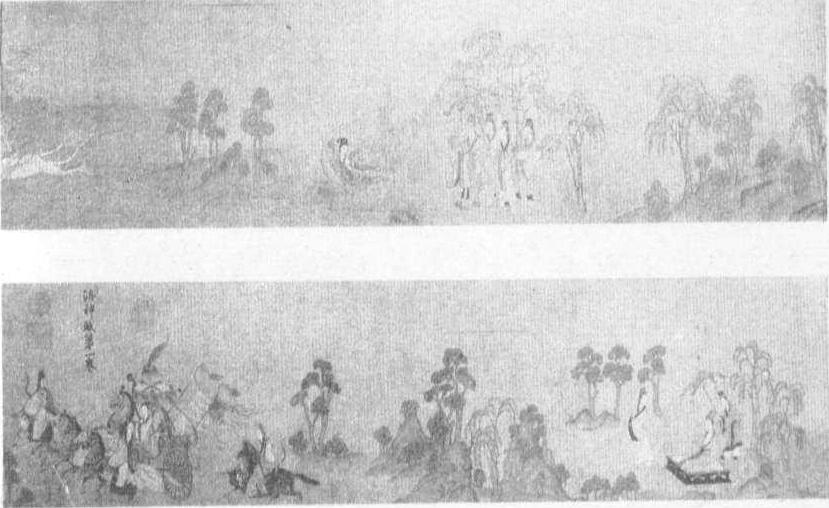 洛神赋图卷(局部) 洛神赋图传为东晋顾恺之所作,宋代摹本很多,今存四种,绢本设色。曾为清宫旧藏。图卷根据三国时期诗人曹植的《洛神赋》构思而成,以一系列极其鲜明的形象组成哀怨缠绵的连续画面。卷首画曹植与侍臣们在 “日既西倾,车殆马烦”,税驾蘅皋,秣驷芝田,容与阳林,流眄洛川之际,遥遥望见瓌姿艳逸的女神,倏忽出现于岩石之畔。女神含情脉脉,回眸顾盼,表现出一种可望不可即的无限情意,体现了赋中 “翩若惊鸿,婉若游龙”,“彷佛兮或轻云之蔽月,飘飘兮若流风之回雪” 的意境。其后依次画了 “冯夷鸣鼓”、“女娲清歌” 以及诸神游戏,与女神的满怀心事故成冲突,与曹植的惊疑不定更显矛盾。构想奇逸,富有戏剧性。卷末画面描绘回到岸上的曹植,坐在洛水岸边,目凝口呆,茫然若失,天已破晓,座前还放着两支点着的残烛。那副懊丧的面孔表明他一夜未曾合眼,意中人来已无望。最后坐上四马盖车,归乎东路,但还是一路回头怅望, 表现出 “揽騑辔以抗策, 怅盤桓而不能去” 的留恋神态。顾恺之 (346—407年),字长康,小字虎头,晋陵无锡 (今属江苏) 人,做过东晋十二个官僚的幕僚。多才艺,工诗赋、书法,尤精绘画。有 “虎头三绝” (才绝、画绝、痴绝) 之称。多作人物肖像、佛像及神仙。传其二十多岁左右为江宁瓦官寺绘制维摩诘像,“画讫光彩耀目数日”,轰动江宁城。 洛神赋图东晋画家顾恺之根据三国时曹植的《洛神赋》而创作的巨幅绢本着色画卷。画面上一系列极其鲜明的形象,表现了哀怨缠绵的情思。笔法秀劲,笔致生动,意致潇洒。现存画卷是后人的摹本。 洛神赋图东晋·顾恺之作。绢本设色,纵27.1厘米、横572.8厘米,现存摹本(宋摹本)四卷,分别藏于故宫博物院、辽宁省博物馆和美国佛里尔美术馆。这是以较大篇幅来描写文学作品的情境、创作的大型绘画作品。此图取材于汉魏文学家曹植的名篇《洛神赋》,描写曹植由京师返途中渡洛水与洛水女神相遇而爱恋、终因人神路隔而无奈分离的故事。画卷从曹植与其随从在洛川遇洛神起,到洛神离去止,全卷用画来表述欢乐、哀怨、怅惘、别离的感情世界。曹植与洛神相逢的画面:曹植双手分开众人,步履趋前,欲语无言,眉目顾盼之情与众侍从目光呆滞形成鲜明的对比,正是曹植一人“睹一丽人于岩之畔”诗句的描绘。洛神驾六龙云车离去的场面:文鱼、玉鸾、鲸鲵诸神怪环绕云车,动态各异;而洛神凝神幽思,哀婉叹息。使人们在画面色彩和造型中似乎听到水族天禽喧啸、笙歌行乐以及神女们的咏叹,衬托出主人翁的悲怨离别之情,与原作中以华丽诗句描写无奈离愁有异曲同工之妙。图中背景山石树木的画法古朴典雅、情态古拙。人物绘制细腻多姿,注意表现出内心感情的世界。此画成为研究中国绘画理论系统形成时期的珍贵资料,在美术史上有重要研究价值。