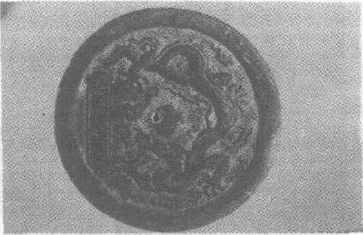 明。直径12厘米。浙江省金华地区文物管理委员会藏。铜镜圆形,背面中央有圆形钮,钮外饰五爪龙纹,并衬以云纹及水波纹。龙的造型粗放,姿态优美,鳞片刻画粗简。钮左侧有长方形戳,上铸有阳文:“洪武二十二年正月造。”“洪武”,明太祖皇帝朱元璋的年号。“洪武二十二年”即公元1389年。