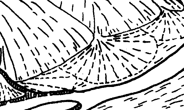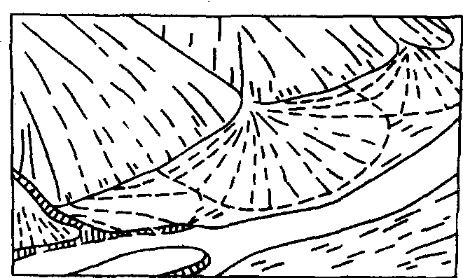 图2 洪积扇的发育和构造运动的关系 a.山前下沉,洪积扇不断地向平原方向伸展,沉积物增厚; 洪积扇形成之后,如山体不断抬升,山前地带相对下沉,在老洪积扇前面可形成新的洪积扇,构成串珠状洪积扇,而老洪积扇被沟谷水流切割成洪积台地。如果洪积扇基部发生构造活动,则引起洪积扇变形(图2)。因此对洪积扇形态组合分析,可以得出山麓地带新构造运动的结论。 洪积扇Hongjishan山地暂时性洪流将大量风化碎屑物质带出山口,形成以沟口为中心的半圆形扇状堆积体(图1)。洪积扇在纵方向上,上陡下缓,顶部坡度较大,一般为15—20°,向下坡度渐缓,至扇缘地带一般只有1—2°的坡降。在横剖面上呈凸形。在物质组成上,从上向下粒度由粗变细,顶部堆积以粗大砾石为主,向下物质渐细,由砾石、粗沙到粉沙、亚粘土。洪积扇的规模有大有小,长度仅数十米的小洪积扇,由于体积小,坡度陡,具有锥体外形,也称洪积锥。在山麓地带,若干个小型洪积扇连在一起呈带状分布称为洪积扇裙。大型的洪积扇纵向长度可超过数十公里,其厚度可由数十米到上百米。在山前地区几个大洪积扇连在一起组成山前洪积平原。洪积扇广泛分布在干旱、半干旱地区山前地带。在干旱半干旱地区降雨主要集中在夏季,降雨变率很大,经常以阵雨、暴雨形式出现,可以在短时间内形成很大洪流。又加干旱半干旱地区,地表植被稀少,大量风化碎屑物集中在地表,很容易被洪水带走。山区溪流或季节性河流,河床狭窄,坡度很大,每当暴雨来临,便能迅速形成洪水,流速很快,携带大量泥沙,向下游奔流,水流出沟口,坡降骤减,地面开阔,流速大减,原来集中的水流一下散开,形成放射状细枝分流,使大量泥沙、砾石立即沉积下来,形成扇状堆积体,称为洪积扇。洪积扇形成以后,如果山体不断抬升,山前平原相对下降,在老洪积扇前形成新洪积扇,如果先形成的洪积扇也随之抬升,则再新生成的洪积扇将向前伸展,形成新老洪积扇串珠式的排列,我国河西走廊一带常有串珠状洪积扇发育。如果新构造运动在山前出现不等量的升降,则在洪积扇形态上表现为侧向移动,新、老扇向一侧叠置。若山前发生断裂,则洪积扇前移并变形(如图2所示)。通过对洪积扇形态分析,可以了解山麓地带新构造运动的活动方式和强度。