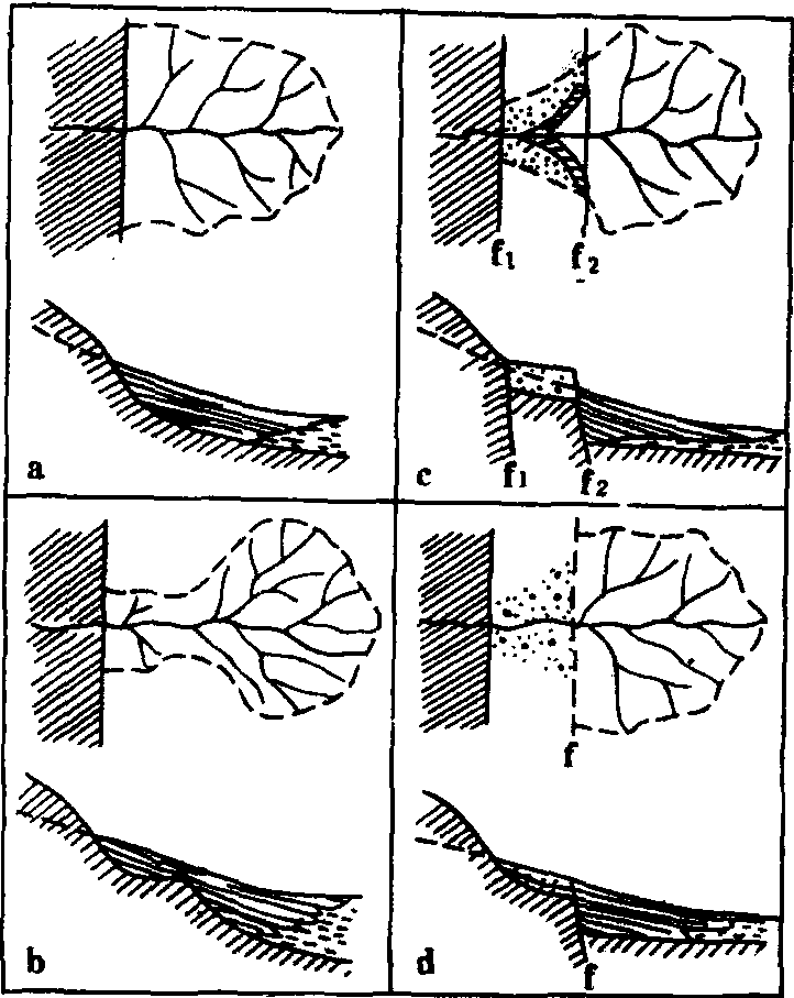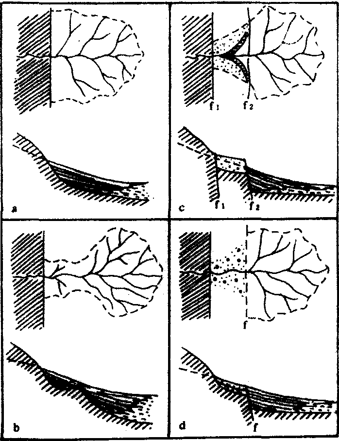 图2 洪积扇的发育和构造运动的关系 a.山前下沉,洪积扇不断地向平原方向伸展,沉积物增厚;b.洪积扇基底发生褶皱,洪积扇向拗陷部分伸展,沉积增厚,隆起 部分沉积物变薄; c.山前洪积扇上发生断层活动,老洪积扇被抬升,新洪积扇嵌入在 老洪积扇内,老洪积扇形成洪积阶地; d.山前洪积扇上发生断层活动,新洪积扇向平原方向迁移 |