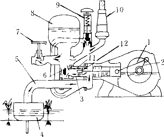 活塞式药液泵工作原理图 1. 连杆 2. 曲柄 3. 泵缸 4. 吸液滤网 5. 进液管 6. 出液阀 7. 出液截止阀 8. 空气室 9. 调压阀 10. 压力指示器 11.活塞12.进液阀 |