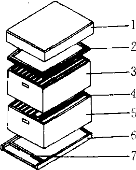 重叠式郎氏十框蜂箱 1. 大盖 2. 副盖 3. 继箱 4. 巢框 5. 巢箱 6. 箱底板 7.巢门挡 |