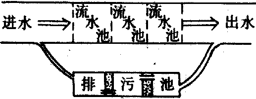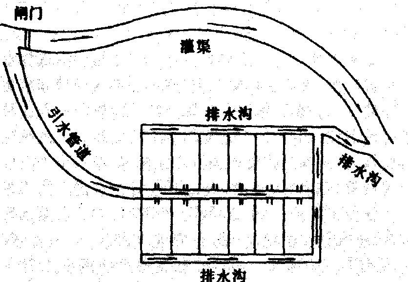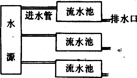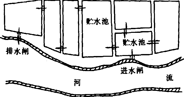 (b) 并联鱼池 图1 流水鱼池排列形式 流水养鱼形式 通常根据水源类型分为: ❶自然流水式。是利用灌渠水(图2)、潮汐水(图3)、溪泉水等天然水源,依地形建筑鱼池,鱼池构造简单,采用土池或水泥池,面积由几平方米至几千平方米。一般不需要动力提水或只需低扬程提水,用过的水不再回收使用。这种养殖方式投资较少、成本较低。 ❷温流水式。是利用工厂废热水或温泉水等热水源,经过简单的增氧或降温处理后养鱼,用过的水不回收重复使用。这种养殖方式不受季节气候限制,可以控温缩短养殖周期,产量较高。其设施除需要抽水动力设备、输水管道和流水池外,还需要附设增氧调温池。工厂废热水水温变化在20~60℃之间,温泉水在30~80℃之间,除引用温热水外,还要引用其他水源或抽取地下冷水源(17~20℃),把水温调节引适宜温度(如鲤科鱼为28~32℃)后才能养鱼。 ❸循环过滤式(见工厂化养鱼)。
