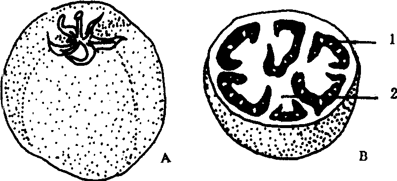图3 猕猴桃浆果的内部构造 1. 外果皮; 2. 中果皮; 3. 维管束; 4. 心室5. 种子; 6. 中轴部分; 7. 异细胞 浆果berry肉质果的一种类型。由复雌蕊的上位子房或下位子房发育而来,外果皮薄,中果皮、内果皮和胎座均肉质化,浆汁丰富,含一至多粒种子。上位子房发育来的,如番茄、葡萄等;下位子房形成的,如香蕉。 |