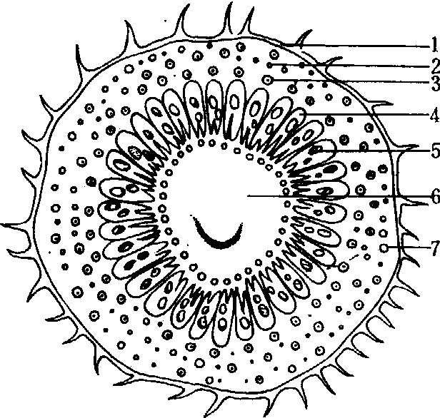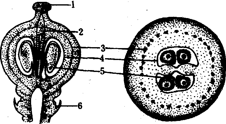 图 1 葡萄果粒的内部构造 左. 纵切面; 右. 横切面 1. 柱头底; 2. 果心维管束; 3. 维管束环4. 果心; 5. 种子; 6. 果蒂 葡萄的果实构造(图1)。果皮最外是一层表皮细胞,致密而光滑, 上覆蜡质果粉。表皮下8~10层壁较厚的细胞,幼果时含叶绿体, 成熟时褪绿; 有色品种含花青素, 呈现黄、红、紫、黑等不同色彩。在有香气的果实中, 外果皮还含有芳香物质, 不同种和品种香型不同, 如欧亚种的许多栽培品种为玫瑰香型, 美洲种多为草莓香型。中果皮与内果皮形成柔软多汁的果肉, 仅由维管束环将其分为内外两层。最内层是内表皮细胞。果肉中有无色素,依品种而异, 如玫瑰香、黑罕、巨峰、佳利酿等品种, 果肉无色素, 果汁白色;紫北塞、黑赛比尔等品种及河岸葡萄、燕垒、山葡萄, 果皮和果肉都有色素, 果汁红色。内表皮以内为心室, 由2个心皮构成, 每室2个胚珠, 形成1~2粒种子, 个别品种无籽。种子与果肉分离的难易, 因种而异, 美洲种有肉囊, 不易分离; 欧亚种无肉囊, 易分离。果粒与果柄相接膨大处, 称果蒂。果柄内部有维管束直达果顶, 并有分支与果肉及种子相连, 去粒后仍留在果柄上, 称果刷。不同品种果蒂、果刷有一定差异。 猕猴桃的果实构造(图2、3)。外表皮多为褐色,由一层木栓化细胞形成, 皮孔和表皮有毛或无, 因种而异。中华猕猴桃, 表皮常具单细胞毛、单列多细胞毛和多列多细胞毛。果皮下的果肉组织, 由圆或近圆形的薄壁细胞组成, 大小不一,直径20~200微米。果心中央有一果心轴, 由小型的长圆形薄壁细胞组成。整个果肉遍布许多大型异细胞,为分泌组织, 内含粘液。每室含多数胚珠, 形成许多小型棕色种子。种子纵扁椭圆形,种皮有网纹,由一层被角质的木栓化细胞组成。胚小, 胚乳发达, 由6层以上多角形无间隙的薄壁细胞组成, 内含大量淀粉。