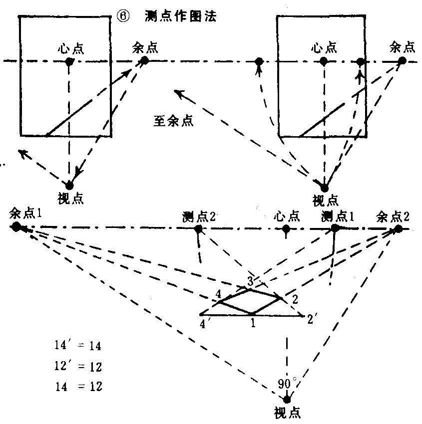 测点作图法Cedian zuotu fa利用测点进行作图的方法。❶先画视点确定左右消灭点和测点。 |