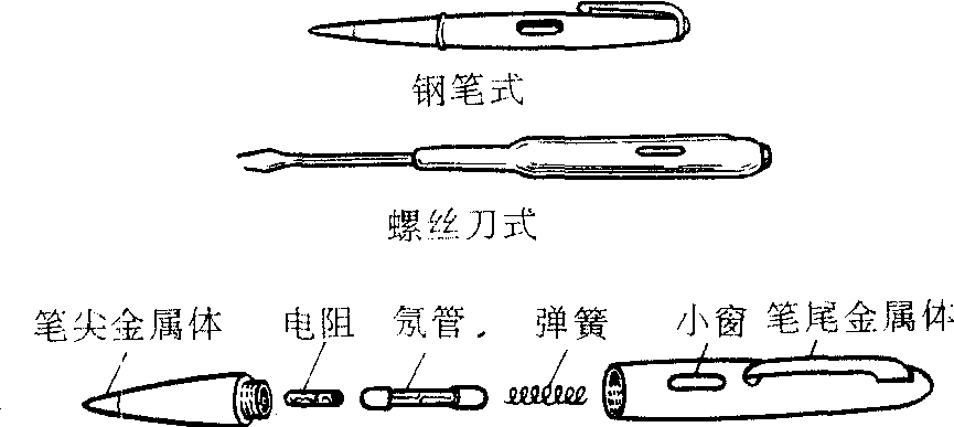 | 释义 | 测电笔cedianbi测试导线、电器和电气设备是否带电的常用电工工具,又称试电笔。外形通常有钢笔式和螺丝刀式两种(见图),钢笔式测电笔由笔尖金属体、电阻、氖管、笔杆小窗、弹簧、笔尾金属体等部分组成。如果把测电笔的笔尖金属体与带电物体(如火线)接触,笔尾金属体与人手接触,氖管就会发光,笔内的电阻大约1~2兆欧,当电流通过时,人并无触电感觉。氖管发光,证明被测物体带电。这样可判断电路是否带电,判断火线和零线。测电笔在每次使用之前要在带电的火线上预先进行测试,检查它是否完好。低压测电笔只能在对地电压250伏以下使用。