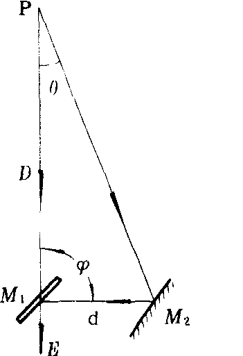 | 释义 | 测距仪cejuyi用以测定物体与观察者之间距离的光学仪器。图中示出了一种简单测距仪的光路原理。自被测物体P发出的光线,从两个窗口进入仪器,分别射至分光板M1和平面反射镜M2。射至M1的光线有一部分透过M1,在E处通过目镜进行观察,可看到物体P的像。射至M2的光线经M2反射至M1,再经M1反射部分光线,通过目镜观察,也看到物体P的像。两个像若未恰好重合,可转动M2,直到重合为止,此时角ᵠ应为90°。M1和M2之间的距离d为已知,角θ的大小可根据M2所转动到的位置确定。于是,P到观察者的距离为 D=dctgθ, 其数值可从仪器上的刻度直接读出。这种测距仪用单目镜观察,称为叠像测距仪。还有一种测距仪用双目镜观察,根据体视原理进行测距,称为体视测距仪。测距仪有许多应用,例如测量远物的距离、在军事上用以描准敌人的阵地、测量飞机的高度、在精密照相机上用于调焦等。