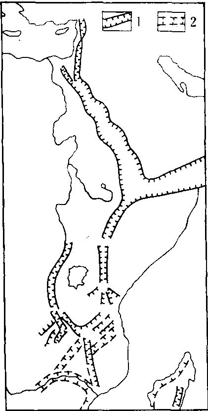 东非大裂谷 1.新生代裂谷凹地2.中生代地堑 东非大裂谷Great Rift Valley在非洲东部。北起约旦地沟,经红海、埃塞俄比亚高原和东非高原,南迄赞比西河河口。长约6000公里,是世界上最长大的断层陷落带。裂谷宽几十至200公里,最深达2000余米。谷底多湖泊,沿线多火山、地震。 东非大裂谷亦称东非大地堑。位于非洲东部,包括一系列由块状断裂形成的南北走向的裂谷和湖盆。南起希雷河口,至马拉维湖北端分东西两支: 东支经坦桑尼亚中部的埃亚西湖、纳特龙湖,接连肯尼亚北部的图尔卡纳湖,再纵穿埃塞俄比亚高原中部的阿巴亚湖、兹怀湖等,直达红海北端,全长5,000多公里; 西支南起赞比亚的郎瓦河,经坦噶尼喀湖、基伍湖、爱德华湖、阿伯特湖直到阿伯特罗河谷,全长1,700公里。世界最长最大的断层陷落带。裂谷宽200公里,两侧陡崖壁立,高出谷地1,000-2,000米。沿线多高大火山,地震活动剧烈,在火山熔岩中蕴藏着大批古人类、古生物化石,是地质学、考古学、人类学的宝贵研究资料,近年根据板块构造学说推断,裂谷带是由于同阿拉伯古地块相分离的大陆漂移运动形成的。 |
