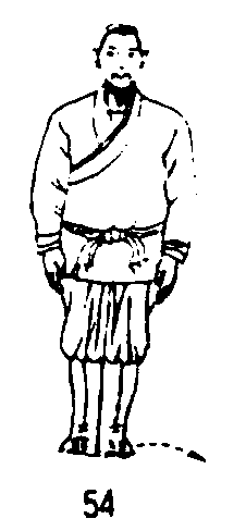 四十九式经络动功预备势之一。要求:松静站立,虚空心胸,绵吸微吐,气沉丹田,口唇轻闭,舌抵上腭,两掌垂于体侧,掌指朝下,双目垂帘或平视前方。(图54)