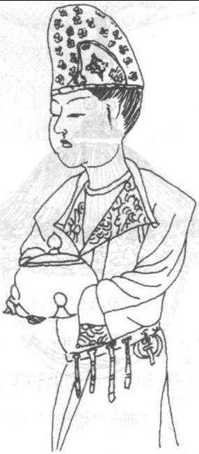 浑脱帽(敦煌莫高窟159窟壁画) 浑脱帽唐代一种男用锥形帽。源自西北少数民族。浑脱,原为一种革囊。因此帽与浑脱相似,故名。起初,用皮革或毛毡制成,为男子常服。唐代初年,太尉长孙无忌(封赵国公)将席帽内衬羊皮,创制羊毛浑脱帽,为当时人所效仿。因无忌为胡人,故这种帽又称“赵公浑脱”。后演变为女帽,以锦绣为之,成为唐代妇女着胡服的一个组成部分。