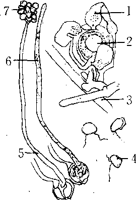 丝囊霉属 1.雄器 2. 卵孢子 3. 菌丝 4. 游动孢子 5.排空的孢子囊 6. 孢子囊 7. 休止孢 |