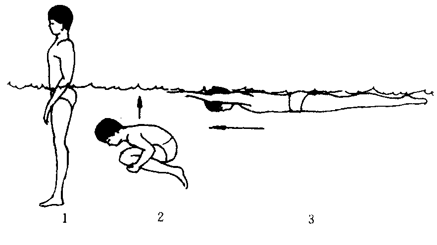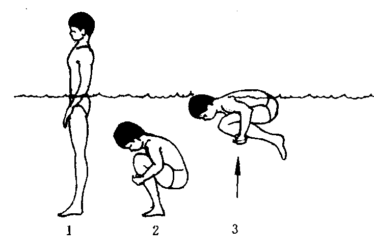 教学重点 ❶身体在水中成为浮体时要自然放松,团身时须低头,展体时身体要伸直。结合憋气练习逐渐延长浮体时间。 ❷对学生站立时应注意加以保护,以防站立不稳而倒入水中。对超过学生胸深以上的水中不宜做此练习。 |