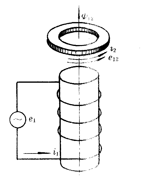 浮于通有交变电流铁心线圈上的轻质铝环,通常称为浮环实验。浮环实验示意图如图1所示。圆铁被用来增强交变电流E1所产生的磁场,设铁心为软铁,使得穿过铁心上空的轻质铝环的磁通∅12与电流i1是同位相的。这里有两个电路,一个是通有交变电流i1的铁心线圈。(以下标1),另一闭合电路是铝环(以下标2)。∅12将在铝环中引起感应电动势e12。由法拉第电磁感应定律知,e12落后∅12位相π/2。若il=Iimsinωt,则∅12=∅msinωt,e12=Emsin(ωt-π/2)。因为铝环的电阻R2很小,铝环的自感L2的作用必须加以考虑。铝环是一个R2、L2串联的电路,在这个电路中加有电动势e12。铝环电流i2将落后e12一个位相角ᵠ。由交流电路知识知tgᵠ=ωL2/R2。为简化问题的讨论,设ᵠ=π/4。因而有如下关系: