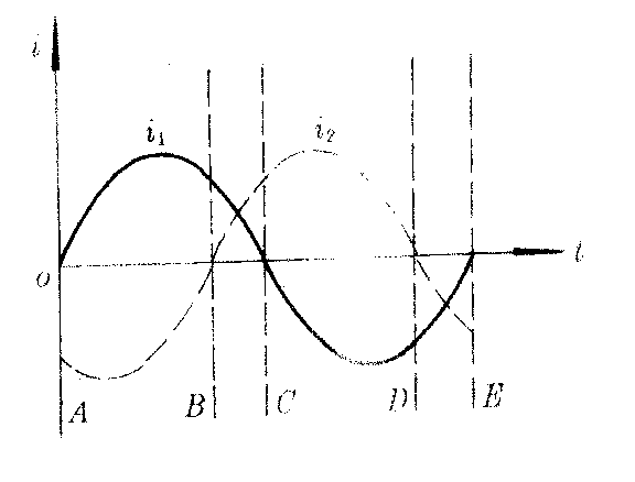 即e12落后i1位相π/2,i2又落后e12位相π/4,故i2落后i1位相3/4π。i1与i2的位相如图2所示,图中假定I2m=I1m。图1中实线箭头分别表示i1、∅12、e12、i2各量的正方向,即它们的真实方向与箭头方向一致时为正,反之为负。结合图2和图1可给浮环实验以正确解释。❶看图2时间轴的AB段:i1>0,i2<0,这段时间里,线圈(电路)1电磁铁的效果是铁心上端为磁极的N极;对电路2,i2为负,铝环(电路2)的下端等效于N极。两个N极相互排斥,铝环受一向上的推力。