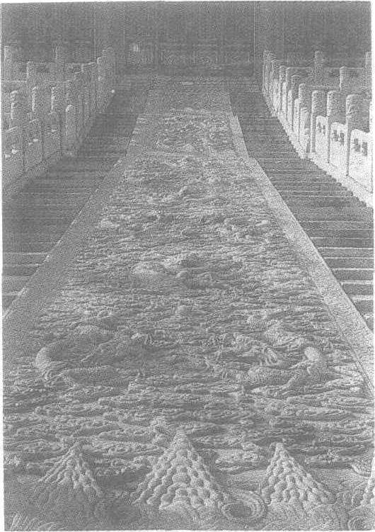 | 释义 | 浮雕九龙戏珠御路石明。长1657厘米,宽307厘米,厚17厘米,重约200吨。这是北京故宫外朝保和殿北面的御路阶石。阶石中间是典型的九龙戏珠纹饰:波涛汹涌,宝山飘浮的海面上,祥云簇集,九条雄姿勃勃,充满活力的巨龙盘曲虬卷于云海中,翻腾起舞,追逐着火珠,尽情戏嬉,仿佛瞬间即会从石上跃出一样,形象生动传神。阶石的左右边缘,浅浅地刻着延续不断的卷草纹。御路石雕刻之精,选材之巨,均可称为古代石雕艺术的瑰宝。这块石雕是北京故宫中最大的艾叶青石雕,它是从离北京百里之外的房山县大石窝开采的。为运此巨石,特意选在严冬季节进行,一路上靠挖井汲水泼路,结冰后再用旱船拉运,可见工程之艰辛。