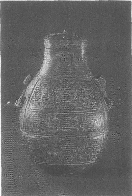 | 释义 | 浮雕凤虎纹兽首贯耳铜壶春秋。盛酒、水器。通高34.2厘米,口径8.9厘米,口宽7.9厘米,腹围69.7厘米。1936年河南省辉县琉璃阁出土。河南省博物馆藏。此壶体椭圆略方,有盖,口直底平。两侧各有兽首贯耳,可以穿带,便于提携。耳下有浮雕双虎,张口对尾,头向上卷成环形。器身除颈部素而无饰,其他均有较精的纹饰,器身底纹为夔纹,周身至颈饰有凸起绳纹将全器界为八格。腹上部前后两面各饰浮雕饕餮两面。中部为浮雕有两只凤鸟和两头伏虎。左侧上为凤纹,下为虎纹。右侧上下均为小鹿,也系浮雕。其动物形态极为生动有力,颇不常见。下部用夔龙组成饕餮纹,又似窃曲纹。盖上面中间原有一钮可执,惜为脱落,仅留残痕。周为方形素地,外周为夔纹,四周各饰一立体蛙纹,头向外。此器装饰繁丽,做工精细,形态生动,有很高的艺术价值。