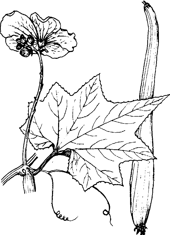 图 2 有棱丝瓜 生长发育和果实形成 自播种至拉秧,一般需90~120天(或更长)。发芽期5~7天,幼苗期15~25天。抽蔓期10天左右,开花结果期60~80天。丝瓜属短日照植物,在长日照下雄花和雌花着生节位提高。在长日和短日照下低温有促进雌花生长的作用。丝瓜耐热,适温为25~30℃,30℃以上也能正常生长。抽蔓期以前需要短日照和稍高温度,促使茎叶生长和雌花分化,开花结果期则需要较高温度和长日照或强光照,促进营养生长和开花结果。生长前期高温、长日照易徒长,延迟开花结果。后期温度低,日照不足,生长弱,结果少,采收期也短。一般先发生雄花,后发生雌花。若苗期给予低温短日照,可提早着花,还会先发生雌花。第一个雌花后,各节能连续发生雌花。雌花开放后18天左右果实最重,生产上多在开花后15天左右采鲜果,食用品质佳,也减少与其他果实竞争养分,能提高座果率。果实的生理成熟需要50天左右。主、侧蔓都能结果。 栽培技术 长江流域和长江以北各地,多在春季播种育苗。长江流域和长江以南各地,多在春季播种育苗,断霜后定植,6月至8月采收。华南地区分春播、夏播和秋播。春瓜2月至3月播种育苗,4月中旬至7月中旬采收;夏瓜4月至5月播种育苗,6月至8月采收;秋播瓜6月至8月播种,9月至11月采收。夏播气温高,日照长,茎叶生长旺盛,往往延迟发生雌花,应选用对短日照要求不严格,在长日照下仍能较早发生雌花的品种,或通过育苗给予短日照处理,提早发生雌花。丝瓜适于在各种土壤栽培。栽培方式有棚架、人字形支架或无支架等。 丝瓜茎叶生长旺盛,需进行植株调整。支架栽培者,先地面压蔓,主蔓在雌花座果前后上架。上架后“之”字形引蔓,结果前一般不留侧蔓,结果后选留强壮,早生雌花的侧蔓,摘除幼弱侧蔓。夏植丝瓜茎蔓生长特别旺盛,可以在结果前选留1~2条强壮侧蔓,发生雌花后引蔓上架。棚架栽培,结果前在地面盘蔓和压蔓,上棚后让侧蔓任意生长,并均匀分布棚面。 丝瓜生活力强,结果潜力大,应施足基肥并注意结果期追肥。幼苗期和抽蔓期需水量少。盛果期需要水最多,需经常保持土壤较高湿度。 病虫害及防治 主要病害有褐斑病、炭疽病、蔓枯病、疫病、花叶病等(见黄瓜)。虫害有瓜蚜和黄守瓜等(见蔬菜虫害)。 褐斑病(Cercospora citrullina) 为真菌病。危害叶片,初生水浸状斑点,扩大成0.5~1.3厘米,黄褐色或灰白色,边缘褐色,圆形或不规则形病斑。高湿时病斑出现稀疏灰白色霉,严重时全叶黄枯死。以菌丝块随病残株土表越冬,借风雨传播,高温多雨时易发生。宜轮作。收获后彻底清除病残体,烧毁或深埋。喷洒代森锰锌、百菌清、多菌灵等杀菌剂。 丝瓜Sigua一年生攀援草本,卷须2—4叉。叶互长,叶片轮廓三角形或近圆形,通常掌状5裂。雌雄同株。雄花序总状,雌花单生,花黄色,直径5—9厘米,雄蕊5,药室多回折曲。瓠果圆柱形,无棱角,长15—50厘米。种子黑色。原产东印度。我国各地栽培。嫩果可作蔬菜炒食。果成熟干燥后里面有网状纤维称丝瓜络,可洗刷器皿用,或入药,能通经络。另一种棱角丝瓜(八棱瓜)(Luffa acutangula)亦常栽培,主要区别是果有8—10条纵棱和沟,叶裂较浅,用途同丝瓜。 丝瓜sponge gourdLuffa cylindrica Roem.,又称普通丝瓜。葫芦科,丝瓜属。一年生草本。原产亚洲热带地区。中国中部和南部多栽培。果长圆筒形,长25~30 cm,皮绿色,肉绿白色,嫩果肉细嫩。种子黑色,表皮光滑,有翅状边。2n=2x=26。喜高温,较耐湿。春播,夏秋季采收,需搭棚架引蔓。为高温季节蔬菜品种之一。嫩果作蔬菜。叶、茎、花、果、丝瓜络等有清热凉血等功效。 |