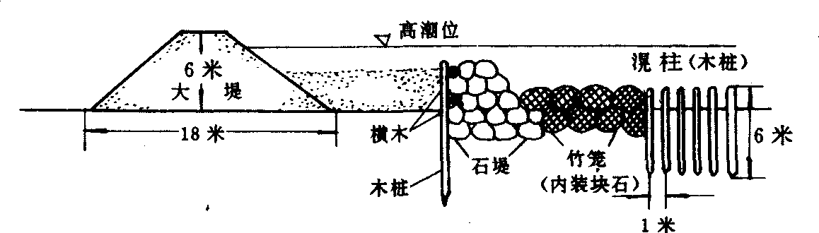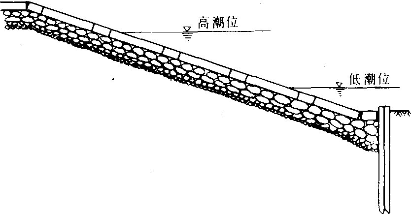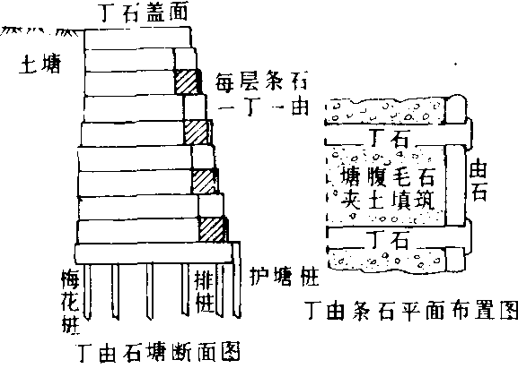 图1 五代吴越竹笼木桩塘 定四年(1327)又创建“石囤木柜塘”,筑于海宁一带海岸,该地为粉沙性土质,抗冲力低。当时在沿海30余里的海岸线上下,下石囤44万多个,木柜470多个。石囤和木柜分别以竹笼和木框装石而成,塘前用木桩固定,木柜与木柜之间用横木联接。此塘比“竹笼木桩塘”更加坚固稳定。柴塘 北宋大中祥符五年(1012),筑于杭州至海宁地段。此塘是用柴土相间夯实,塘身打入木桩加以联结,还用树枝荆条等铺垫底层。柴塘就地取材,简单易行,抗冲能力大,适宜于沙土浮松、承载力差的地段。 斜坡式石塘 又称“坡陀塘”。北宋王安石在鄞县创建,是在土塘的迎水面斜坡上用条石护砌(见图2)。明成化十三年(1477),杨瑄在浙江海盐仿王安石“坡陀塘”修筑“竖砌坡陀塘”。其筑法先打木桩奠基,基桩上置横石为枕,然后用片石循序竖砌,砌完一排片石,又置一条横石,逐渐向上砌筑,里面用碎石填心,塘背以土培筑。斜坡式石塘能较好地削弱波浪的冲击力,砌筑容易,省工省料,应用比较广泛。