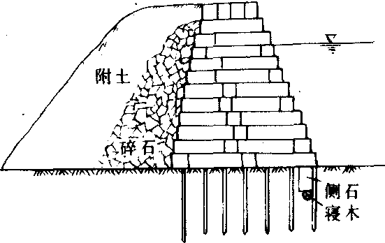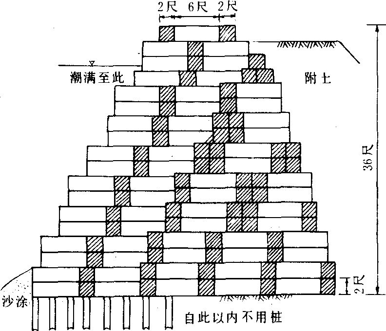 图3 北宋直立式石塘 改为纵横叠砌法。塘下打基础,塘前布设挡浪木桩。元至正元年(1341),叶恒在余姚筑重力式桩基石塘2100余丈。筑法是在塘基打木桩,基础以上以条石纵横叠砌,最后以大条石侧置盖顶。此塘有两处创新:一是在石塘内坡与附土结合处,用厚一尺左右的碎石作反滤层;二是在第一行木桩后,深埋横木,上以条石侧置,防止潮流掏刷塘脚(见图4)。元至正七年王永仿效叶恒的方法,又修筑上虞后海塘1944丈。但所砌石塘的迎水面改为壁立式。明代继续修筑直立式桩基石塘。明弘治元年(1488),海盐筑石塘900余丈。此塘兼采“坡陀