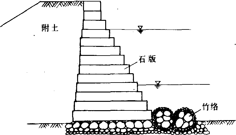 图2 北宋王安石斜坡式石塘 直立式石塘 北宋庆历四年(1044),在杭州筑直立式石塘2200余丈。塘身用条石砌筑,共13层,迎水面逐级内收,呈台阶形,塘后附土培筑。又用竹络作护坦,保护塘基(见图3)。后南宋淳熙十六年(1189)定海县令唐叔翰在镇海县西北筑石塘600丈。所砌条石