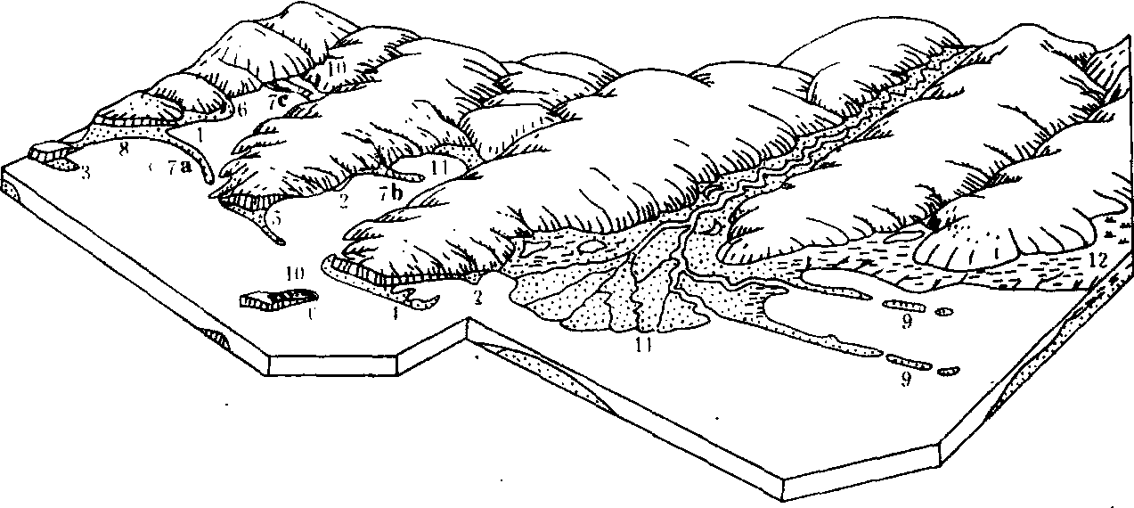 图2 海岸堆积地貌图示 1,海滩2,角滩3,沙嘴4,翼状沙嘴5,箭状沙嘴6,环状沙坝7,拦湾坝(7a湾口坝、7b湾中坝、7c湾内坝) 8,连岛坝 9,离岸堤10,泻湖11,三角洲12,泥滩 进入海岸带的松散物质,在波浪、海流和潮汐的推动下进行运动,并在一定条件下堆积起来,形成各种海积地貌(图2)。海岸带的泥沙、砾石在岸边堆积成为向海缓倾的滩地,称为海滩。根据其物质组成可分为砾石滩、沙滩和泥滩。根据海滩的形态又可分为堤式海滩和斜坡式海滩。海滩大规模的发育扩展,相邻海滩连接成片,成为广阔而平坦的海积平原。有些滨海平原可能蕴藏丰富的滨岸砂矿或石油、天然气等。叠置在海滩上,与海岸大体平行的长堤状堆积体,称为滨岸堤。朝海一面和缓,朝陆一面堤坡较陡,常有几条沿岸平行分布。按其物质组成分为砂堤、砾堤和贝壳堤。堤顶高度相当于形成时的最大风浪高度,研究滨岸堤的高度变化可以反映海平面的升降变化。由波浪激浪流堆积作用形成的,在岸边海中的长条形坝状堆积体,称为沙坝。沙坝顶部一般露出海面,由沙和砾石组成,常含有较多的贝壳碎片。沙坝一般可高出海面几米,宽达几百米,长达几公里或更长。由于沙坝在海岸不同的位置上堆积,其形态不同,名称各异,如图2所示。由波浪和激浪流堆积在离岸一定距离,并出露海面的沙坝,称为离岸坝(又称岸外坝);在岬角和河口处,受沿岸流的作用形成的沙坝,一端与陆地相连,另一端向海伸展,称为沙嘴;沙嘴不断向前伸展,形成拦湾坝;拦湾沙坝把海洋部分隔开,成为与海分离的浅湖,叫泻湖。有的泻湖仍有水道与海相通,有的泻湖与海完全隔离,湖水可能变为淡水。沿岸海流形成的沙坝将岸外岛屿与陆地连接起来,称为连岛坝。河流带来的大量泥沙在入海口处堆积形成三角洲。在平静海湾中,海水流动缓慢,使大量细粒物质,如粘土、生物碎屑等沉积形成泥滩。 海岸地貌壮族地区面临北部湾,有防城、北海、钦州、企沙、珍珠等天然良港。海上岛屿众多,海岸类型多样。南流江口和钦江口为三角洲型海岸,洲岛众多,水下沙洲发育;铁山港、大风江口、茅岭江口和防城河口为溺谷海岸,海水深入谷地几十公里;钦州、防城两县沿海主要为山地型海岸,海岸线特别曲折,沿岸多暗礁和岛屿;北海市和合浦县营盘一带为台地型海岸,海岸线比较平直。沿海滩涂面积约7.5万公顷,海底平坦,海水较浅,一般水深20至35米,鱼贝类丰富,为发展海产品生产的有利场所。 |