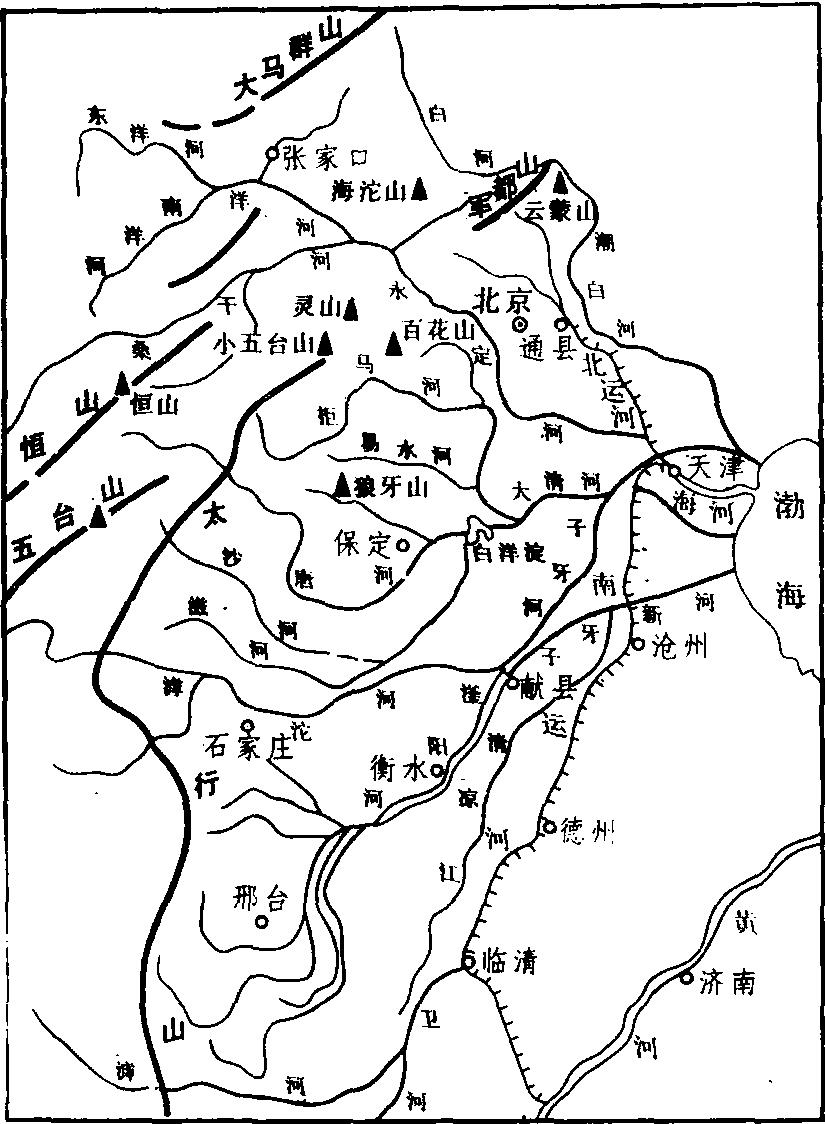 海河水系示意图 海河中国华北第一大河。包括北运河(含蓟运河、潮白河)、永定河、大清河、子牙河、漳卫河等五水系以及独流入海的陡骇河、马颊河和黑龙港地区的河流。流域面积26.5万平方公里。五水系源出冀北山地和黄土高原,以漳卫河上游卫河为源,长1090公里。过去五个水系中除蓟运河独流入海外,其余各河从西南、西、北三方汇集于天津,经海河干流由大沽入渤海,成一扇状水系,常溢流泛滥。现多沿人工新河入海。干流长74公里。 海河海河水系包括永定河、大清河、子牙河、漳卫南运河、北运河、潮白河和蓟运河等河,均在天津附近汇入海河,由大沽口注入渤海。流域面积26.34万 km2,以卫河为源全长1090 km,干流长73 km,设计行洪能力1200 m3/s。年平均降水量560 mm,是中国大陆东部沿海降水量最少的地区。太行山和燕山山前年降水量700~800 mm,东部平原年降水量500~600 mm,山西雁北地区年降水量不足400 mm。6~9月降水量占全年的75%~85%。大雨年份降雨更加集中,如1963年獐 |