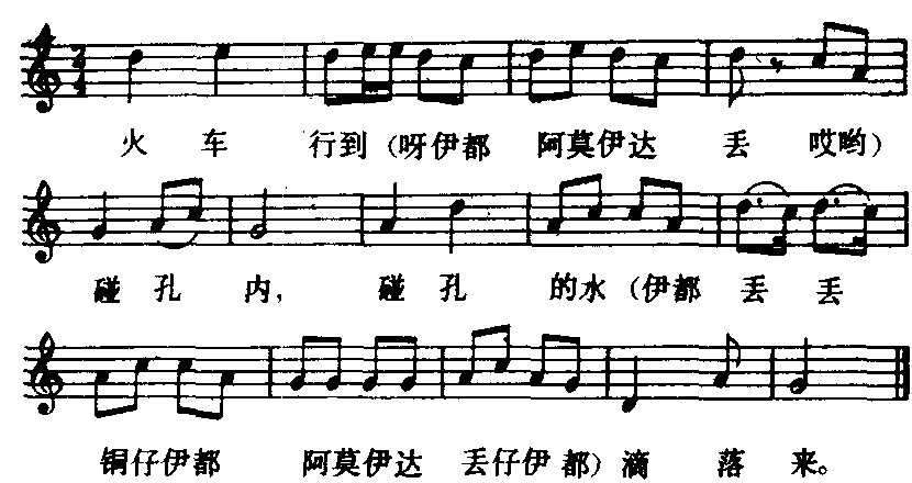 | 释义 | 丢丢铜台湾民歌。也称作丢丢铜仔。它原是一首儿童们在丢扔铜板游戏时,边玩边唱的民歌。又因早期风行于宜兰地区,故也叫宜兰调。传说宜兰早年初通火车时,人们远道而来聚集观看,便兴高采烈地唱起了这首民歌,所以歌词总是唱着:“火车行到碰孔内(碰孔,即隧道),碰孔的水滴落来。”情绪活泼轻快,衬词别致有趣。音乐为上下句体单乐段结构,前乐句6小节,后乐句8小节,为五声徵调。