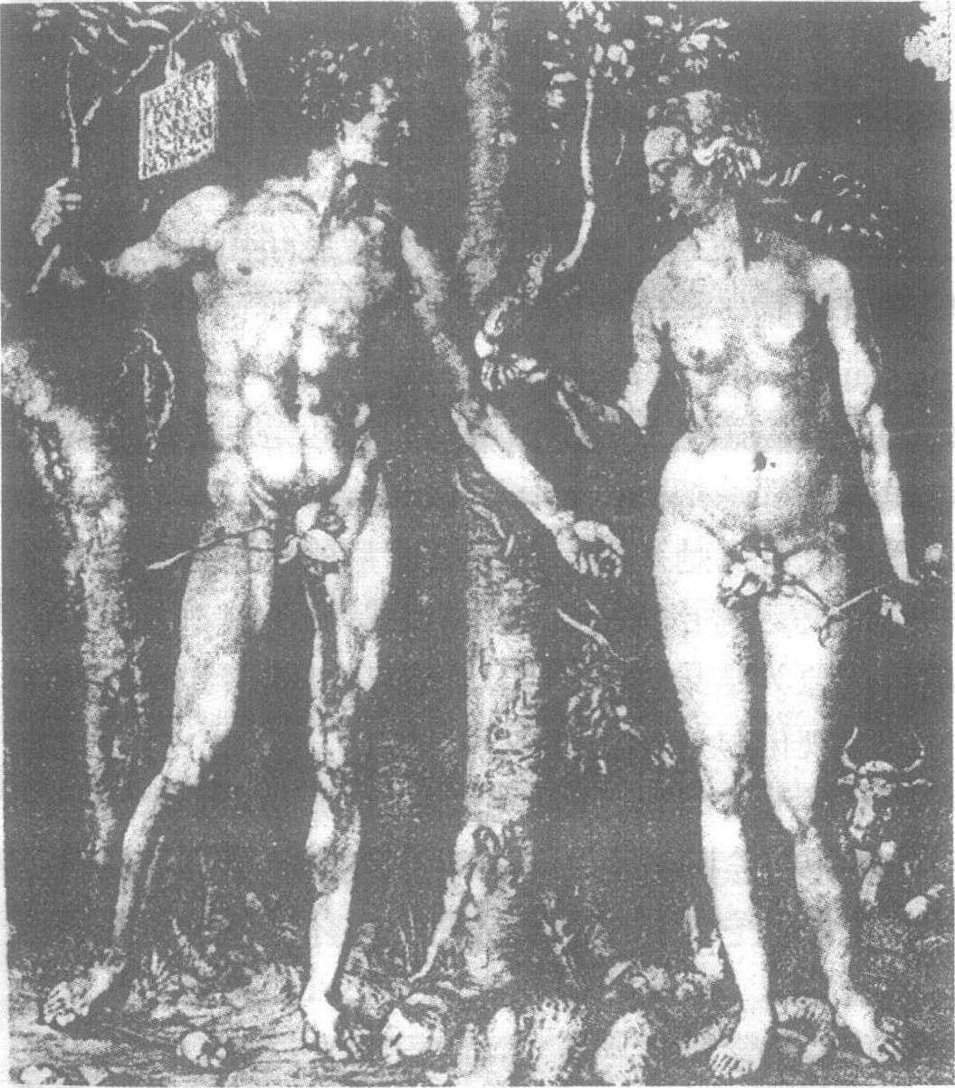 | 释义 | 丢勒《亚当、夏娃与动物》这是一幅铜版画。它不使用颜色而只用线条进行描绘。先用刻刀把画刻在金属板(铜板)上,然后再通过印刷制作而成。所以作者不只要靠眼睛,而且还要有耐心和精湛的技艺。在这幅画中,大体的形体和量感,深远的背景,还有人体的肌肤和毛发、树皮、动物的毛皮等手触的差别,均得到了恰当的表现。
